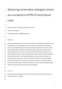 Conservation biological control is commonly considered to be a key component of IPM because it is compatible with and complementary to many other approaches available in the IPM ‘toolbox’. However, despite significant study of conservation biological approaches in horticultural systems, uptake has been limited. Furthermore, whilst there are many studies that provide examples of positive implementations, there are as many studies in which the evidence for benefits to pest control is either inconsistent or absent . We suggest that careful consideration needs to be given to the scale at which studies of conservation biological control are conducted (both spatial and temporal) and the metrics that are recorded. To-date there has been a bias towards ecological studies, with relatively scant consideration of the economic impacts of conservation biological control measures. We propose a framework for the future study of conservation biological control approaches, which centres around economic costs and benefits.