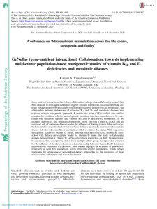 Vimaleswaran, K. S. ORCID: https://orcid.org/0000-0002-8485-8930 (2021) GeNuIne (gene-nutrient interactions) collaboration: towards implementing multi-ethnic population-based nutrigenetic studies of vitamin B12 and D deficiencies and metabolic diseases. Proceedings of the Nutrition Society, 80 (4). pp. 435-445. ISSN 0029-6651 doi: 10.1017/S0029665121002822