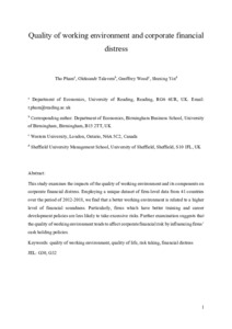 Pham, T., Talavera, O., Wood, G. and Yin, S. (2022) Quality of working environment and corporate financial distress. Finance Research Letters, 46 (PartB). 102449. ISSN 1544-6123 doi: 10.1016/j.frl.2021.102449