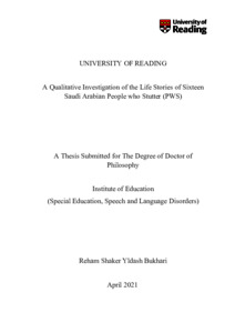 Bukhari, R. S. Y. (2021) A Qualitative Investigation of the Life Stories of Sixteen Saudi Arabian People who Stutter (PWS). PhD thesis, University of Reading. doi: 10.48683/1926.00100429