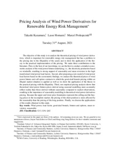 Kanamura, T., Homann, L. and Prokopczuk, M. (2021) Pricing analysis of wind power derivatives for renewable energy risk management. Applied Energy, 304. 117827. ISSN 0306-2619 doi: 10.1016/j.apenergy.2021.117827