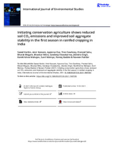 Karbin, S., Kassam, A., Oza, A., Sawhney, T., Sahu, P., Mogare, B., Mitra, B., Viswakarma, S., Singh, J., Mahajan, R., Malviya, S., Badole, P. and Patidar, N. (2022) Initiating conservation agriculture shows reduced soil CO2 emissions and improved soil aggregate stability in the first season in rainfed cropping in India. International Journal of Environmental Studies, 79 (6). pp. 998-1014. ISSN 1029-0400 doi: 10.1080/00207233.2021.1987050