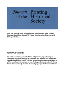Ross, F. ORCID: https://orcid.org/0000-0002-1094-2961 (2021) Invisible hands: tracing the origins and development of the Linotype Devanagari digital fonts. Journal of the Printing Historical Society, 3 (2). pp. 111-153. ISSN 0079-5321