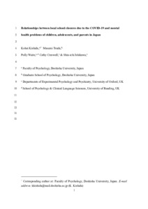 Kishida, K., Tsuda, M., Waite, P. ORCID: https://orcid.org/0000-0002-1967-8028, Creswell, C. and Ishikawa, S.-i. (2021) Relationships between local school closures due to the COVID-19 and mental health problems of children, adolescents, and parents in Japan. Psychiatry Research, 306. 114276. ISSN 0165-1781 doi: 10.1016/j.psychres.2021.114276