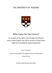 Johnson, I. F. (2021) Who cares for the carers? An analysis of the rights and remedies of informal carers under English law and an account of how these might be extended by original legislation. PhD thesis, University of Reading. doi: 10.48683/1926.00101510
