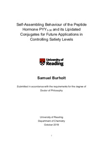 Burholt, S. (2021) Self-assembling behaviour of the peptide hormone PYY3-36 and its lipidated conjugates for future applications in controlling satiety levels. PhD thesis, University of Reading. doi: 10.48683/1926.00101559