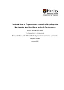 Coleman, B. (2021) The dark side of organisations: A study of Psychopaths, Narcissists, Machiavellians, and Job Performance. DBA thesis, Henley Business School, University of Reading. doi: 10.48683/1926.00101563