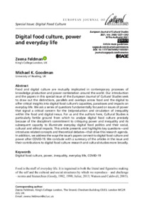 Food and digital culture are mutually implicated in contemporary processes of knowledge production and power contestation around the world. Our introduction and the papers in this special issue of the European Journal of Cultural Studies seek to draw out the distinctions, parallels and overlaps across food and the digital to offer critical insights into digital food culture’s capacities, paradoxes and impacts on everyday life. We ask a series of questions fundamentally focused on issues of power that signal a critical concern for the (re)production and circulation of inequality within the food and digital nexus. For us and the authors here, Cultural Studies is particularly fertile ground from which to analyse digital food culture precisely because of the discipline’s commitment to critiquing power and inequality and its subsequent capacity to illuminate everyday digital food politics and their social, cultural and ethical impacts. This article presents and highlights key questions—and introduces related concepts and theoretical debates—that drive this research agenda. In addition, we address the ways the issue’s papers connect to digital food culture and power after COVID-19. We conclude with a summary of the articles in the issue and their contributions to digital food culture research and cultural studies more broadly.
