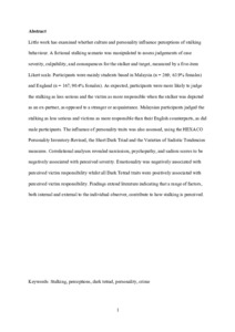 Little work has examined whether culture and personality influence perceptions of stalking behaviour. A fictional stalking scenario was manipulated to assess judgements of case severity, culpability, and consequences for the stalker and target, measured by a five-item Likert scale. Participants were mainly students based in Malaysia (N = 269; 63.9% females) and England (N = 167; 90.4% females). As expected, participants were more likely to judge the stalking as less serious and the victim as more responsible when the stalker was depicted as an ex-partner, as opposed to a stranger or acquaintance. Malaysian participants judged the stalking as less serious and victims as more responsible than their English counterparts, as did male participants. The influence of personality traits was also assessed, using the HEXACO Personality Inventory-Revised, the Short Dark Triad and the Varieties of Sadistic Tendencies measures. Correlational analyses revealed narcissism, psychopathy, and sadism scores to be negatively associated with perceived severity. Emotionality was negatively associated with perceived victim responsibility while all Dark Tetrad traits were positively associated with perceived victim responsibility. Findings extend literature indicating that a range of factors, both internal and external to the individual observer, contribute to how stalking is perceived.