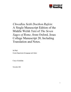 Gadsden, C. (2021) Chwedleu Seith Doethon Rufein: A Single Manuscript Edition of the Middle Welsh Text of The Seven Sages of Rome, from Oxford, Jesus College Manuscript 20, Including Translation and Notes. MPhil thesis, University of Reading. doi: 10.48683/1926.00101840