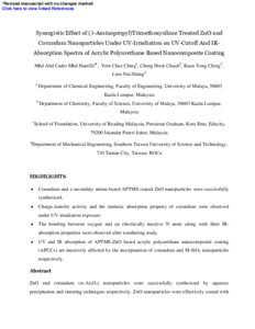 Mohd Haniffa, M. A. C., Ching, Y. C., Chuah, C. H., Ching, K. Y. ORCID: https://orcid.org/0000-0002-1528-9332 and Liou, N.-S. (2019) Synergistic effect of (3-Aminopropyl)Trimethoxysilane treated ZnO and corundum nanoparticles under UV-irradiation on UV-cutoff and IR-absorption spectra of acrylic polyurethane based nanocomposite coating. Polymer Degradation and Stability, 159. pp. 205-216. ISSN 0141-3910 doi: 10.1016/j.polymdegradstab.2018.11.009