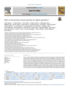 Ingram, J., Maye, D., Bailye, C., Barnes, A., Bear, C., Bell, M., Cutress, D., Davies, L., de Boon, A., Dinnie, L., Gairdner, J., Hafferty, C., Holloway, L., Kindred, D., Kirby, D., Leake, B., Manning, L., Marchant, B., Morse, A., Oxley, S., Phillips, M., Regan, A., Rial-Lovera, K., Rose, D. C., Schillings, J., Williams, F., Williams, H. and Wilson, L. (2022) What are the priority research questions for digital agriculture? Land Use Policy, 114. 105962. ISSN 0264-8377 doi: 10.1016/j.landusepol.2021.105962