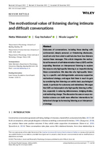 Abstract: Outcomes of conversations, including those dealing with controversial, deeply personal, or threatening disclosures, result not only from what is said but also from how listeners receive these messages. This article integrates the motivational framework of self‐determination theory (SDT) and the expanding literature on interpersonal listening to explore the reasons why high‐quality listening is so impactful during these conversations. We describe why high‐quality listening is a specific and distinguishable autonomy‐supportive motivational strategy, and argue that there is much to gain by considering that listening can satisfy basic psychological needs, in particular for autonomy and relatedness. We argue that SDT can help explain why high‐quality listening is effective, especially in reducing defensiveness, bridging divides, and motivating change. The discussion focuses on ways motivation science can build more effective interventions for behavioral change by harnessing listening as an interpersonal strategy.