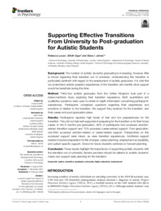 Lucas, R., Cage, E. and James, A. I. (2022) Supporting effective transitions from university to post-graduation for autistic students. Frontiers in Psychology, 12. 768429. ISSN 1664-1078 doi: 10.3389/fpsyg.2021.768429