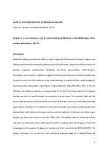 Watson, G. L. and Gilchrist, R. ORCID: https://orcid.org/0000-0002-1967-2558 (2021) Objects: the archaeology of medieval healing. In: McCleery, I. (ed.) A Cultural History of Medicine in the Middle Ages (800-1450). Bloomsbury, London, pp. 107-129. ISBN 9781472569929