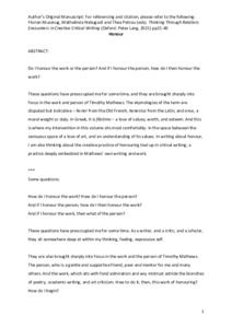 Do I honour the work or the person? And if I honour the person, how do I then honour the work? These questions have preoccupied me for some time, and they are brought sharply into focus in the work and person of Timothy Mathews. The etymologies of the term are disputed but indicative – honor from the Old French, honestus from the Latin, and onus, a moral weight or duty. In Greek, it is filotimo – a love of values, worth, and esteem. And this is where my intervention in this volume sits most comfortably: in the space between the sensuous space of a love of art, and an understanding of its values. In writing about honour, I am also thinking about the creative practice of honouring tied up in critical writing; a practice deeply embedded in Mathews’ own writing and work.