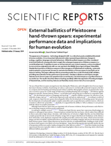Milks, A. ORCID: https://orcid.org/0000-0003-0779-6200, Parker, D. and Pope, M. (2019) External ballistics of Pleistocene hand-thrown spears: experimental performance data and implications for human evolution. Scientific Reports, 9 (1). ISSN 2045-2322 doi: 10.1038/s41598-018-37904-w