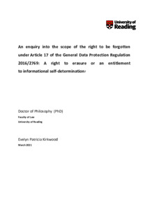 Kirkwood, E. P. (2021) An enquiry into the scope of the right to be forgotten under Article 17 of the General Data Protection Regulation 2016/2769: A right to erasure or an entitlement to informational self-determination? PhD thesis, University of Reading. doi: 10.48683/1926.00102680