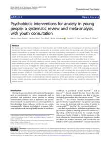 Cohen Kadosh, K., Basso, M., Knytl, P., Johnstone, N., Lau, J. Y.F. and Gibson, G. R. ORCID: https://orcid.org/0000-0002-0566-0476 (2021) Psychobiotic interventions for anxiety in young people: a systematic review and meta-analysis, with youth consultation. Translational Psychiatry, 11. 352. ISSN 2158-3188 doi: 10.1038/s41398-021-01422-7