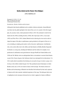 Although Roland Barthes never wrote a play, ‘theatre’ or related terms such as ‘scenario’ or ‘theatricality’ recur throughout his oeuvre from the 1950s to the late 1970s. He wrote many reviews of theatre, but theatre and performance also became integral to much of the theoretical concerns of his later work. During this same period, Samuel Beckett’s dramaturgy was evolving from his first full-length play, Eleutheria, to the later ‘dramaticules’ such as Not I, which premiered in 1973. Barthes did comment on Beckett a few times in his theatre criticism, mainly in relation to En attendant Godot or avant-garde theatre, but there is little overt interchange between them. However, this essay creates a series of ‘dialogues’ by juxtaposing selected plays from different moments in Beckett’s dramaturgical evolution with different moments in Barthes’s writings about theatre: firstly, the reaction against and deconstruction of post-war mainstream French theatre; secondly, theatre’s engagement with history; and thirdly, performance as a paradigm and site for staging multiple versions of the self.