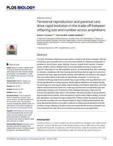 Furness, A. I. ORCID: https://orcid.org/0000-0001-7596-9623, Venditti, C. ORCID: https://orcid.org/0000-0002-6776-2355 and Capellini, I. ORCID: https://orcid.org/0000-0001-8065-2436 (2022) Terrestrial reproduction and parental care drive rapid evolution in the trade-off between offspring size and number across amphibians. PLoS Biology, 20 (1). e3001495. ISSN 1544-9173 doi: 10.1371/journal.pbio.3001495