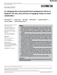 1. Agriculture around the world needs to become more environmentally sustainable to limit further environmental degradation and impacts of climate change. 2. Many governments try to achieve this through enrolling farmers in agri-environment schemes (AES) that encourage them to undertake conservation activities. 3. Studies show that AES can suffer from low uptake, meaning their environmental objectives remain unattained. To succeed for people and nature, policy-makers are increasingly adopting multi-actor approaches in the “co-design” of AES to make them more attractive and inclusive of a full range of stakeholders, including ‘harder to reach’ farmers. 4. To address why some land managers (principally farmers) may be harder to reach in the context of co-designing England’s new Environmental Land Management (ELM) approach, we undertook a quick scoping review of the literature, conducted 23 first-round and 24 second-round interviews with key informants, and held a workshop with 11 practitioners. 5. We outline why farming stakeholders may be harder to reach and how policy-makers can adjust the engagement process to make co-design more inclusive. 6. Based on the results, we make recommendations that could help policy-makers to design better, more inclusive AES that would attract greater uptake and increase their chances of success.