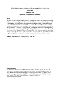 This paper investigates how trade liberalisation has contributed to a dietary shift from one dominated by traditional staples to one high in animal products, a trend that is associated with both improved intake in micronutrients, and higher rates of obesity and other diet-related diseases in developing countries. In the context of India’s trade liberalisation in 1991, we examine whether the difference in consumption of cereals and animal products across rural regions before and after the reforms can be attributed to their differential degree of exposure to tariff reductions. The estimates reveal that trade reforms have a negative impact on cereal consumption through reducing edible oil prices and a positive effect on the consumption of animal products through enhancing consumer tastes towards these foods. These findings provide evidence for the role of trade in supporting dietary diversity and highlight the need for complementary policies to enhance the coherence between trade policy and nutrition actions.
