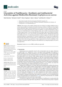 The increase in the number of bacteria that are resistant to multiple antibiotics poses a serious clinical problem that threatens the health of humans worldwide. Nadifloxacin (1) is a highly potent antibacterial agent with broad-spectrum activity. However, its poor aqueous solubility has limited its use to topical applications. To increase its solubility, it was glycosylated herein to form a range of trans-linked (3a-e) and cis-linked (7a,b) glycosides, each of which was prepared and purified to afford single anomers. The seven glycoside derivatives (3a-e, 7a,b) were examined for potency against eight strains of S. aureus, four of which were methicillin-resistant. Although less potent than free nadifloxacin (1), the α-L-arabinofuransoside (3a) was effective against all strains that were tested (minimum inhibitory concentrations of 1–8 μg/mL compared to 0.1–0.25 μg/mL for nadifloxacin), demonstrating the potential of this glycoside as an antibacterial agent. Estimation of Log P as well as observations made during preparation of these compounds reveal that the solubilities of the glycosides were greatly improved compared with nadifloxacin (1), raising the prospect of its use in oral applications.
