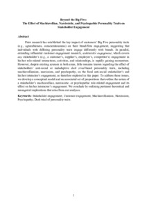 Hollebeek, L. D. ORCID: https://orcid.org/0000-0002-1282-0319, Sprott, D. E., Urbonavicius, S. ORCID: https://orcid.org/0000-0003-4176-2573, Sigurdsson, V., Clark, M. K. ORCID: https://orcid.org/0000-0002-7123-4248, Riisalu, R. ORCID: https://orcid.org/0000-0002-3332-7275 and Smith, D. L. G. (2022) Beyond the big five: the effect of machiavellian, narcissistic, and psychopathic personality traits on stakeholder engagement. Psychology & Marketing, 39 (6). pp. 1230-1243. ISSN 1520-6793 doi: 10.1002/mar.21647