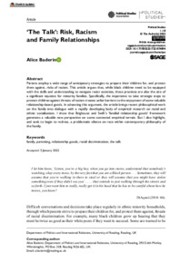 Parents employ a wide range of anticipatory strategies to prepare their children for, and protect them against, risks of racism. This paper argues that, whilst black children need to be equipped with the skills and understanding to navigate racist societies, these practices are also the site of a significant injustice for minority families. Specifically, the imperative to take strategic steps to protect children against threats of racism creates unfair barriers to the enjoyment of some valuable relationship-based goods. In advancing this argument, the paper brings recent philosophical work on the family into dialogue with a rapidly developing body of empirical research on racial and ethnic socialization. I show that Brighouse and Swift’s “familial relationship goods” framework generates a valuable new perspective on some contested empirical terrain. But I also highlight, and seek to begin to redress, a problematic silence on race within contemporary philosophy of the family.