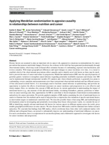 Wade, K. H., Yarmolinsky, J., Giovannucci, E., Lewis, S. J., Millwood, I. Y., Munafo, M. R., Meddens, F., Burrows, K., Bell, J. A., Davies, N. M., Mariosa, D., Kanerva, N., Vincent, E. E., Smith-Byrne, K., Guida, F., Gunter, M. J., Sanderson, E., Dudbridge, F., Burgess, S., Cornelis, M. C., Richardson, T. G., Borges, M. C., Bowden, J., Hemani, G., Cho, Y., Spiller, W., Richmond, R. C., Carter, A. R., Langdon, R., Lawlor, D. A., Walters, R. G., Vimaleswaran, K. S. ORCID: https://orcid.org/0000-0002-8485-8930, Anderson, A., Sandu, M. R., Tilling, K., Davey Smith, G., Martin, R. M. and Relton, C. L. (2022) Applying Mendelian randomization to appraise causality in relationships between nutrition and cancer. Cancer Causes & Control, 33. pp. 631-652. ISSN 1573-7225 doi: 10.1007/s10552-022-01562-1