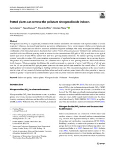 Nitrogen dioxide (NO2) is a significant pollutant in both outdoor and indoor environments with exposure linked to serious respiratory illnesses, decreased lung function and airway inflammation. Here, we investigate whether potted plants can contribute as a simple and cost-effective indoor air pollution mitigation technique. Our study investigates the ability of the combination of the three plant species Spathiphyllum wallisii ‘Verdi’, Dracaena fragrans ‘Golden Coast’ and Zamioculcas zamiifolia with two different growing media to remove in situ concentrations (100 ppb) of NO2 in real-time at two typical indoor light levels (0 and 500 lx) and in ‘wet’ and ‘dry’ growing media conditions. All studied ‘growing medium–plant systems’ were able to reduce NO2 concentrations representative of a polluted urban environment, but to varying degrees. The greatest NO2 removal measured inside a 150 L chamber over 1-h period in ‘wet’ growing media at ~ 500 lx was achieved by D. fragrans. When accounting for dilution, this would correspond to a removal of up to 3 ppb NO2 per m2 of leaf area over the 1-h test period and 0.62 ppb per potted plant over the same period when modelled for a small office (15 m3) in a highly polluted environment. Depending on building ventilation rates and NO2 concentration gradients at the indoor-outdoor interface that will vary massively between polluted urban and rural locations, potted plants offer clear potential to improve indoor air quality—in particular in confined indoor spaces that are poorly ventilated and/or located in highly polluted areas.