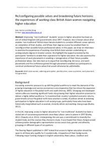 Improving ‘‘non-traditional’’ students’ access to higher education has been an aim of United Kingdom (UK) governments since 1997. However, less is known about what enables ‘non-traditional’ British Asian female students to consider different career options on completion of their studies, and if/how their degree course has enabled them to reconfigure their possible future professional selves. In this paper, we draw on interviews to examine the experiences of working-class British Asian women undertaking an undergraduate degree in Greater London. We highlight the support provided by the participants’ families to enable their aspirations for higher education. We also examine the importance of work placements in enabling a reimagination of their future possible professional selves. Our data lead us to argue that reconfiguring did occur, and work placements and the confidence gained through placements enabled our participants to construct professional future selves that would otherwise be unthinkable.