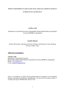 Anik, A. R. and Rahman, S. ORCID: https://orcid.org/0000-0002-0391-6191 (2021) Women’s empowerment in agriculture: level, inequality, progress, and impact on productivity and efficiency. The Journal of Development Studies, 57 (6). pp. 930-948. ISSN 0022-0388 doi: 10.1080/00220388.2020.1817393