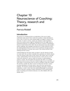 Riddell, P. ORCID: https://orcid.org/0000-0002-4916-2057 (2021) Neuroscience of coaching: theory, research and practice. In: Passmore, J. ORCID: https://orcid.org/0000-0003-0832-7510 and Leach, S. (eds.) Third Wave Cognitive Behavioural Coaching: Contextual, Behavioural and Neuroscience Approaches for Evidence Based Coaches. Pavilion Publishing and Media Ltd, Shoreham-by-sea, pp. 215-254. ISBN 9781803880006