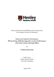 Katsoulis, V. (2021) Essays on corporate governance: SRI investing, skill heterogeneity on firm performance and value creation through M&As. PhD thesis, University of Reading. doi: 10.48683/1926.00104415