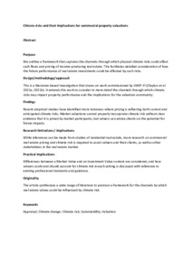 Purpose The authors outline a framework that captures the channels through which physical climate risks could affect cash flows and pricing of income-producing real estate. This facilitates detailed consideration of how the future performance of real estate investments could be affected by such risks. Design/methodology/approach This is a literature-based investigation that draws on work commissioned by UNEP-FI (Clayton et al., 2021a, b). It extends this work to consider in more detail the channels through which climate risks may impact property performance and the implications for the valuation community. Findings Recent empirical studies have identified more instances where pricing is reflecting both current and anticipated climate risks. Market valuations cannot properly incorporate climate risk without clear evidence that it is priced by market participants, but valuers can advise clients on the potential for future impacts. Research limitations/implications While inferences can be made from studies of residential real estate, more research on commercial real estate pricing and climate risk is required to assist valuers and their clients, as well as other stakeholders in the real estate market. Practical implications Differences between a Market Value and an Investment Value context are considered, and how valuers could and should account for climate risk in each setting is discussed with reference to existing professional standards and guidance. Originality/value The article synthesises a wide range of literature to produce a framework for the channels by which real estate values could be influenced by climate risk.