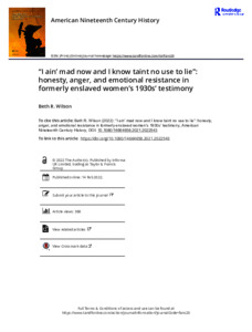 Wilson, B. R. (2021) “I ain’ mad now and I know taint no use to lie”: honesty, anger, and emotional resistance in formerly enslaved women’s 1930s’ testimony. American Nineteenth Century History, 22 (3). pp. 307-326. ISSN 1466-4658 doi: 10.1080/14664658.2021.2022543