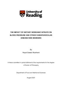 Alzahrani, H. S. (2021) The impact of dietary inorganic nitrate on blood pressure and other cardiovascular disease risk markers. PhD thesis, University of Reading. doi: 10.48683/1926.00104491