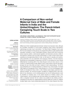 Hodsoll, J., Pickles, A., Bozicevic, L., Supraja, T. A., Hill, J., Chandra, P. S. and Sharp, H. (2022) A comparison of non-verbal maternal care of male and female infants in India and the United Kingdom: the parent-infant caregiving touch scale in two cultures. Frontiers in Psychology, 13. 852618. ISSN 1664-1078 doi: 10.3389/fpsyg.2022.852618