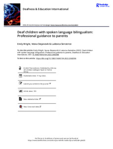 Wright, E., Stojanovik, V. ORCID: https://orcid.org/0000-0001-6791-9968 and Serratrice, L. ORCID: https://orcid.org/0000-0001-5141-6186 (2023) Deaf children with spoken language bilingualism: professional guidance to parents. Deafness & Education International, 25 (1). pp. 21-39. ISSN 1557-069X doi: 10.1080/14643154.2022.2062096