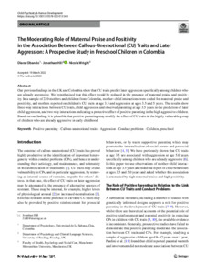 Obando, D., Hill, J. and Wright, N. (2024) The moderating role of maternal praise and positivity in the association between callous-unemotional (CU) traits and later aggression: a prospective study in preschool children in Colombia. Child Psychiatry and Human Development, 55. pp. 14-23. ISSN 1573-3327 doi: 10.1007/s10578-022-01354-3