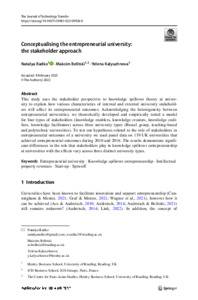 This study uses the stakeholder perspective to knowledge spillover theory at university to explain how various characteristics of internal and external university stakeholders will affect its entrepreneurial outcomes. Acknowledging the heterogeneity between entrepreneurial universities, we theoretically developed and empirically tested a model for four types of stakeholders (knowledge enablers, knowledge creators, knowledge codifiers, knowledge facilitators) across three university types (Russel group, teaching-based and polytechnic universities). To test our hypotheses related to the role of stakeholders in entrepreneurial outcomes of a university we used panel data on 139 UK universities that achieved entrepreneurial outcomes during 2010 and 2016. The results demonstrate significant differences in the role that stakeholders play in knowledge spillover entrepreneurship at universities with the effects vary across three distinct university types.
