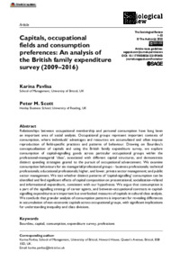 Pavlisa, K. and Scott, P. M. ORCID: https://orcid.org/0000-0003-1230-9040 (2023) Capitals, occupational fields, and consumption preferences: an analysis of the British family expenditure survey (2009-2016). The Sociological Review, 71 (5). pp. 1191-1212. ISSN 0038-0261 doi: 10.1177/00380261221093405