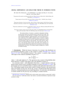 Einmahl, J. H. J., Ferreira, A., de Haan, L., Neves, C. ORCID: https://orcid.org/0000-0003-1201-5720 and Zhou, C. (2022) Spatial dependence and space–time trend in extreme events. Annals of Statistics, 50 (1). pp. 30-52. ISSN 2168-8966 doi: 10.1214/21-AOS2067