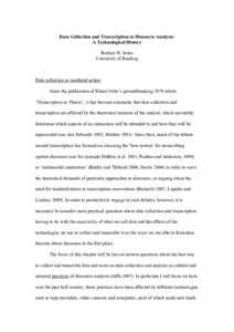 Since the publication of Elinor Ochs’s groundbreaking 1979 article ‘Transcription as Theory’, it has become axiomatic that data collection and transcription are affected by the theoretical interests of the analyst, which inevitably determine which aspects of an interaction will be attended to and how they will be represented (see also Edwards 1993, Mishler 1991). Since then, much of the debate around transcription has focused on choosing the ‘best system’ for transcribing spoken discourse (see for example DuBois et al. 1993, Psathas and Anderson, 1990) or ‘multimodal interaction’ (Baldry and Thibault 2006, Norris 2004) in order to serve the theoretical demands of particular approaches to discourse, or arguing about the need for standardization in transcription conventions (Bucholtz 2007, Lapadat and Lindsay 1999). In order to productively engage in such debates, however, it is necessary to consider more practical questions about data collection and transcription having to do with the materiality of what we call data and the effects of the technologies we use to collect and transcribe it on the ways we are able to formulate theories about discourse in the first place. The focus of this chapter will be less on narrow questions about the best way to collect and transcribe data and more on data collection and analysis as cultural and material practices of discourse analysts (Jaffe 2007). In particular I will focus on how, over the past half century, these practices have been affected by different technologies such as tape-recorders, video cameras and computers, each of which made new kinds of knowledge and new kinds of disciplinary identities possible, and each of which fundamentally changed our understanding of discourse itself.