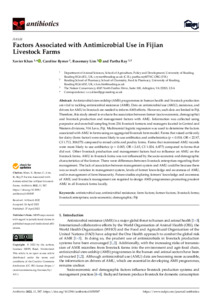 Antimicrobial stewardship (AMS) programmes in human health and livestock production are vital to tackling antimicrobial resistance (AMR). Data on antimicrobial use (AMU), resistance, and drivers for AMU in livestock are needed to inform AMS efforts. However, such data are limited in Fiji. Therefore, this study aimed to evaluate the association between farmer (socio-economic, demographic) and livestock production and management factors with AMU. Information was collected using purposive and snowball sampling from 236 livestock farmers and managers lo-cated in Central and Western divisions, Viti Levu, Fiji. Multinomial logistic regression was used to determine the factors associated with AMU in farms using aggregated livestock farm model. Farms that raised cattle only for dairy (farm factor) were more likely to use antibiotics and an-thelmintics (p = 0.018, OR = 22.97, CI 1.713, 308.075) compared to mixed cattle and poultry farms. Farms that maintained AMU records were more likely to use antibiotics (p = 0.045, OR = 2.65, CI 1.024, 6.877) compared to farms that did not. Other livestock production and management factors had no influence on AMU on the livestock farms. AMU in livestock farms was not influenced by the socio-economic and demographic characteristics of the farmer. There were differences be-tween livestock enterprises regarding their management. The lack of association between man-agement system and AMU could be because there was so much variation in management system, levels of farmer knowledge and awareness of AMU, and in management of farm biosecurity. Future studies exploring farmers’ knowledge and awareness of AMU and livestock management are required to design AMS programmes promoting prudent AMU in all livestock farms locally.