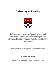 AlOrifan, M. (2020) Influence of Linguistic, Speech Motor, and Executive Control Processes in People with Aphasia, Healthy Younger Adults, and Healthy Older Adults. PhD thesis, University of Reading. doi: 10.48683/1926.00104998