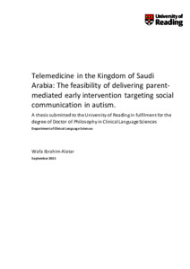 Alatar, W. I. (2021) Telemedicine in the Kingdom of Saudi Arabia: The feasibility of delivering parent-mediated early intervention targeting social communication in autism. PhD thesis, University of Reading. doi: 10.48683/1926.00105197