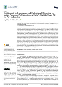 Taylor, B. and Nunes, R. ORCID: https://orcid.org/0000-0003-0829-4130 (2022) Entitlement, indeterminacy and professional discretion in urban planning: problematising a child’s right to clean air for play in London. Sustainability, 14 (10). e6189. ISSN 2071-1050 doi: 10.3390/su14106189